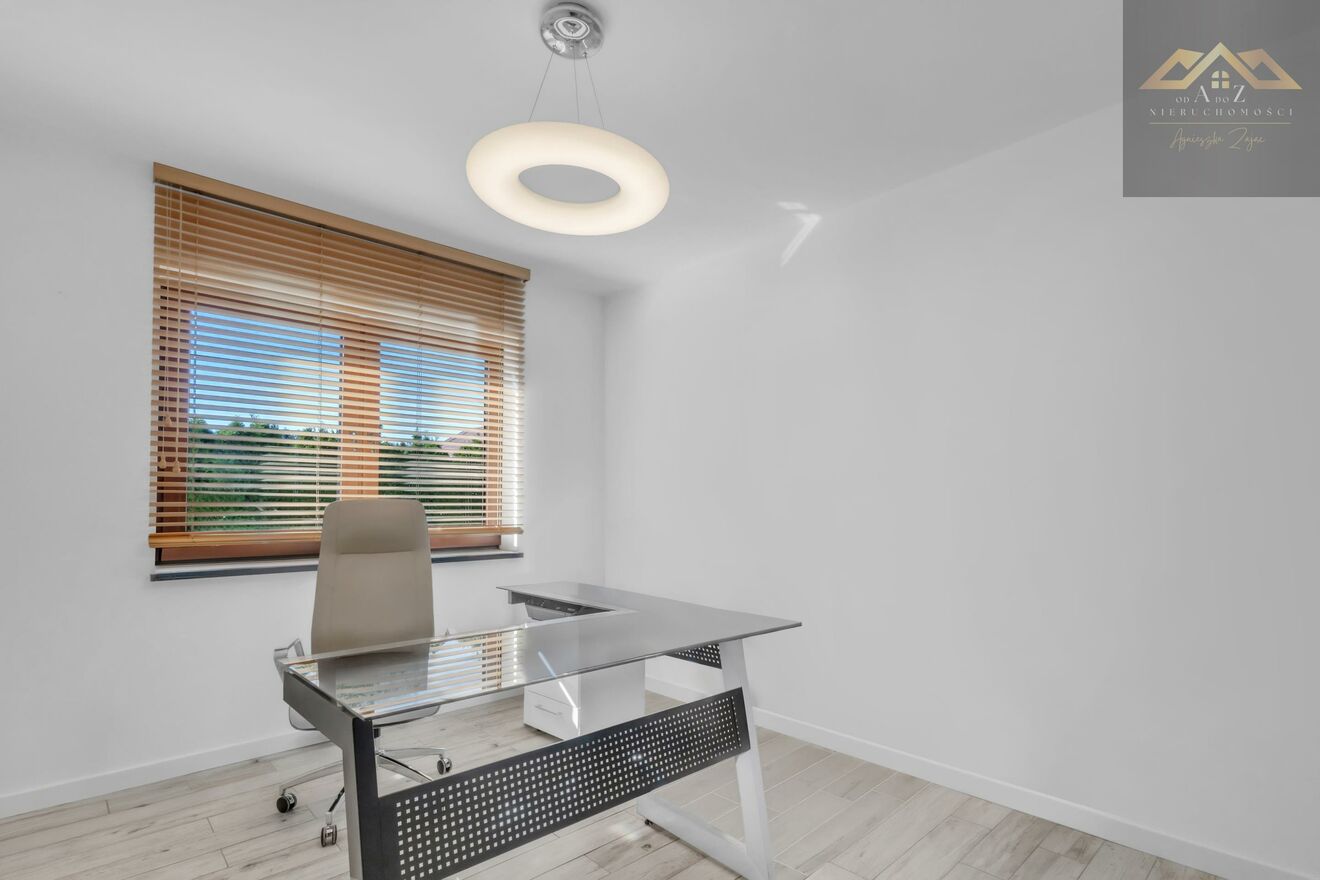 Na parterze znajduje się funkcjonalnie zaprojektowana przestrzeń dzienna: Wiatrołap z dużą szafą w zabudowie, Przestronny hall, Kuchnia z dużą wyspą i blatami granitowymi, w pełni umeblowana i wyposażona w sprzęt AGD, jasny, przestronny salon z kominkiem oraz bezpośrednim wyjściem na taras, jadalnia z miejscem na duży rodzinny stół, komfortowa sypialnia, gabinet, idealny do pracy zdalnej, łazienka z prysznicem, pomieszczenie gospodarcze (kotłownia) z piecem dwufunkcyjnym i urządzeniem do zmiękczania wody, garaż dwustanowiskowy w bryle budynku o powierzchni 45 m.